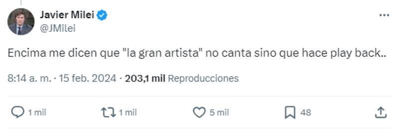 El Presidente respondió este jueves un posteo del usuario @stanleybostero desde donde se acusó a la artista de haber cobrado casi 37.5 millones de pesos por un show en La Rioja. "Encima me dicen que ‘la gran artista' no canta, sino que hace playback", tuiteó.