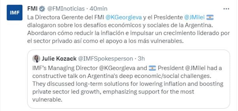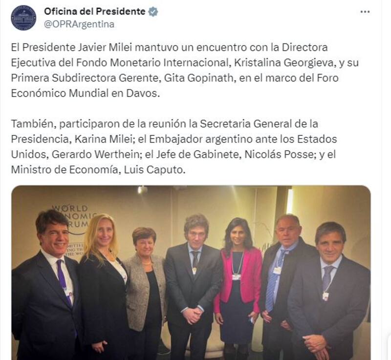 "Muy buena reunión con el Presidente de Argentina, Javier Milei. Hablamos sobre los profundos desafíos económicos y sociales de Argentina y las medidas decisivas que se están tomando para reducir la inflación, promover el crecimiento liderado por el sector privado y utilizar el escaso dinero público para ayudar a las personas más vulnerables", escribió en su cuenta de X Georgieva.