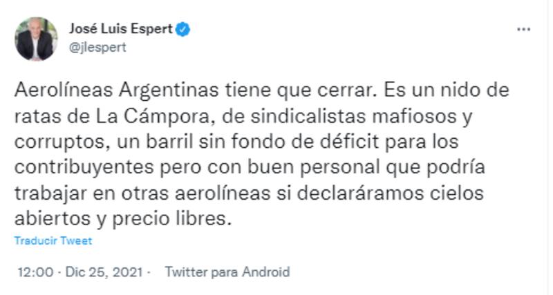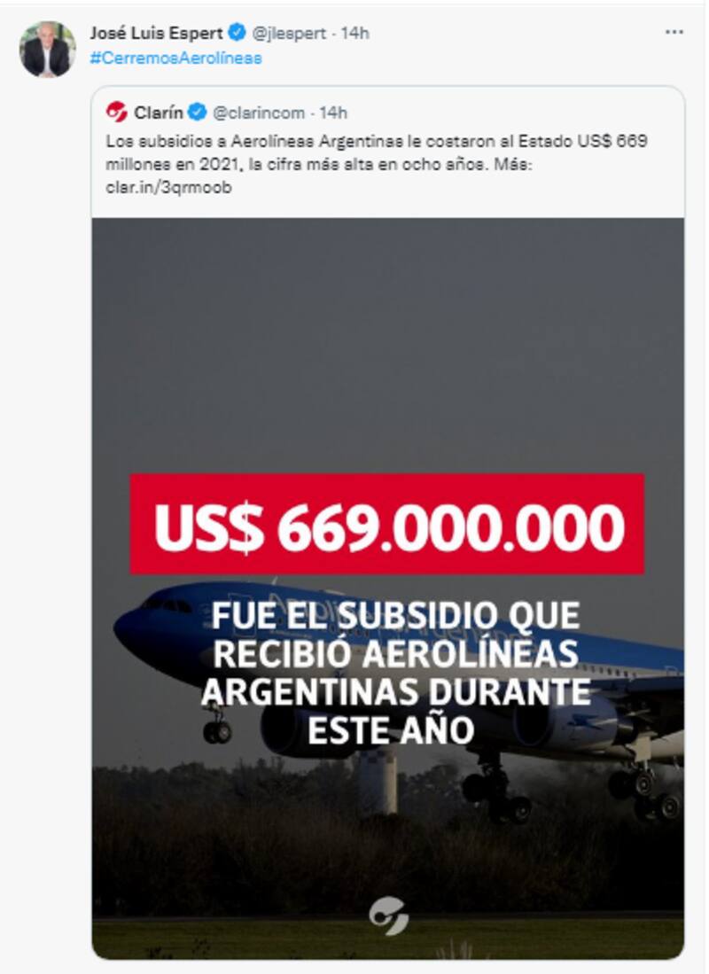 Durante el fin de semana, el economista Espert siguió compartiendo tuits con el hashtag #CerremosAerolíneas. Allí, compartió los números de Aerolíneas Argentinas que lo llevaron a decir, a mitad de 2021, que "el objetivo lo cumplieron: es que Aerolíneas sea un monopolio cerrado".