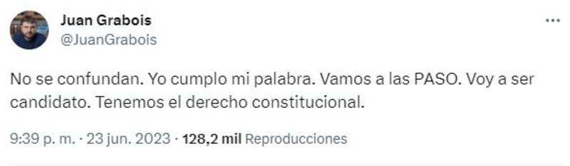 Minutos después, confirmó la noticia en su Twitter. "No se confundan. Yo cumplo mi palabra. Vamos a las PASO. Voy a ser candidato. Tenemos el derecho constitucional", aseguró.