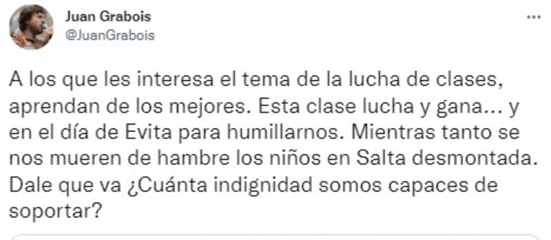 "A los que les interesa el tema de la lucha de clases, aprendan de los mejores. Esta clase lucha y gana... y en el día de Evita para humillarnos. Mientras tanto se nos mueren de hambre los niños en Salta desmontada. Dale que va ¿Cuánta indignidad somos capaces de soportar?", criticó Grabois a través de Twitter.