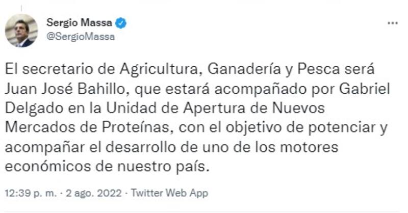 "El secretario de Agricultura, Ganadería y Pesca será Juan José Bahillo, que estará acompañado por Gabriel Delgado en la Unidad de Apertura de Nuevos Mercados de Proteínas, con el objetivo de potenciar y acompañar el desarrollo de uno de los motores económicos de nuestro país", confirmó el propio Massa a través de su cuenta de Twitter.