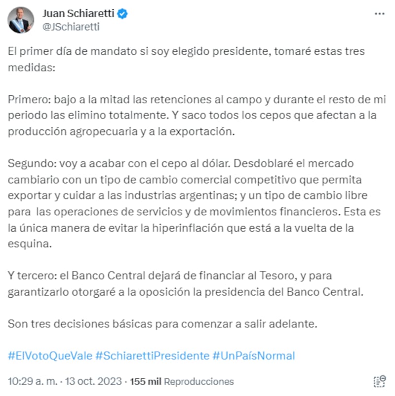 "El primer día de mandato si soy elegido Presidente, tomaré estas tres medidas" comienza diciendo el comunicado del actual gobernador cordobés en la red social X (ex Twitter).