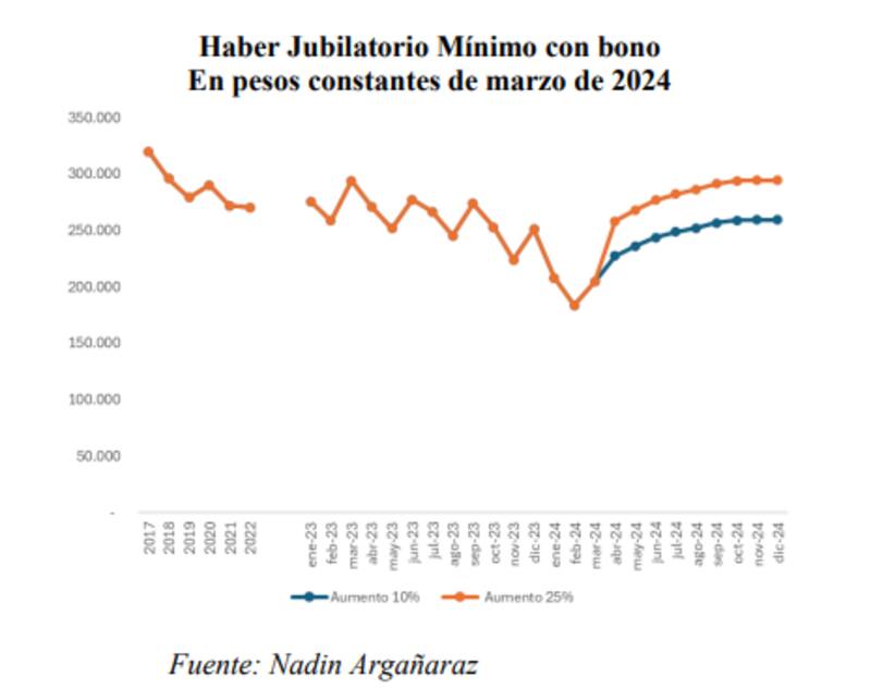 El detalle sobre el ajuste de las jubilaciones por inflación a cargo de Nadín Argañaraz, titular del Instituto Argentino de Análisis Fiscal (Iaraf) indicó que si el Congreso aprueba que en abril se otorgue un aumento igual a la inflación de febrero, más un plus del 10% como compensación, es decir, un bono, los jubilados con la mínima van a terminar el año 2024 con una nueva pérdida real del 10%.