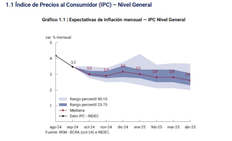 Según el promedio registrado por las consultoras participantes del REM, la inflación mensual de octubre ascendió a 3% (-0,4 p.p. respecto del REM previo), mientras que, en noviembre, se ubicaría en 2,9%.