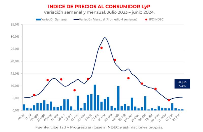 Desde la Fundación Libertad & Progreso suscribieron a un alza de precios durante el sexto mes del año del 5,4%, lo que implicó una suba de 1,2 puntos porcentuales respecto a la medición oficial de mayo (4,2%).