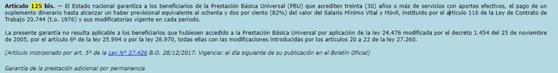 Según estipula el artículo 125 bis incorporado a la Ley 24.241 del Sistema Nacional del Sistema Integrado de Jubilaciones y Pensiones, el Estado nacional "garantiza a los beneficiarios de la Prestación Básica Universal (PBU)" que acrediten treinta (30) años o más de servicios con aportes efectivos, "el pago de un suplemento dinerario" hasta alcanzar un haber previsional equivalente al 82% del valor del SMVM.
