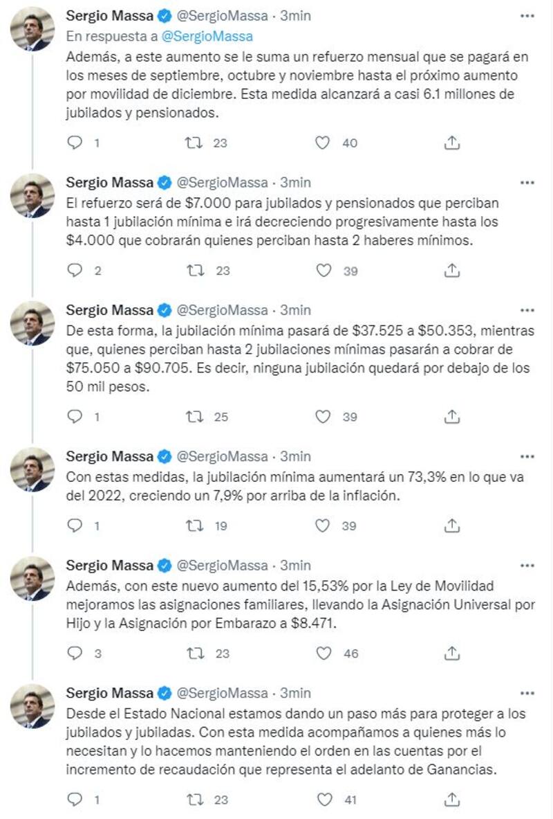 "Ninguna jubilación quedará por debajo de los $ 50 mil. Hemos otorgado un aumento de 15,53% para todas las jubilaciones, pensiones y asignaciones, que comenzará a pagarse en septiembre. La medida alcanza a más de 16 millones de argentinas y argentinos", escribió el Presidente en su cuenta de Twitter.