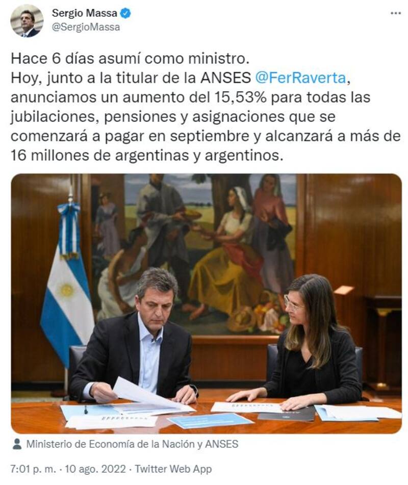 El ministro de Economía, Sergio Massa, y la directora de la Administración Nacional de la Seguridad Social (ANSES), Fernanda Raverta, anunciaron hoy un aumento del 15,53% para jubilaciones, pensiones y asignaciones, medida aplicada por movilidad y que alcanzará a 16 millones de argentinos.