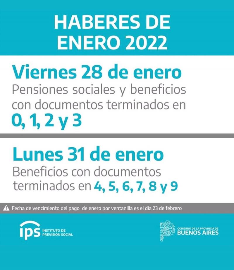 El Instituto de Previsión Social de la Provincia de Buenos Aires (IPS) confirmó este miércoles las nuevas fechas de cobro de enero 2022 para jubilados y pensionados bonaerenses.