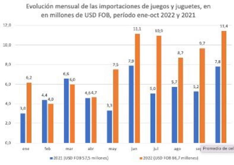 Al analizar las estadísticas de comercio exterior del período enero-octubre del 2022, se observa un acumulado de u$s 80,1 millones (FOB), lo que representa un incremento de las importaciones de juegos y juguetes del 50% respecto al mismo período del 2021, cuando se habían registrado u$s 53,5 millones(FOB).