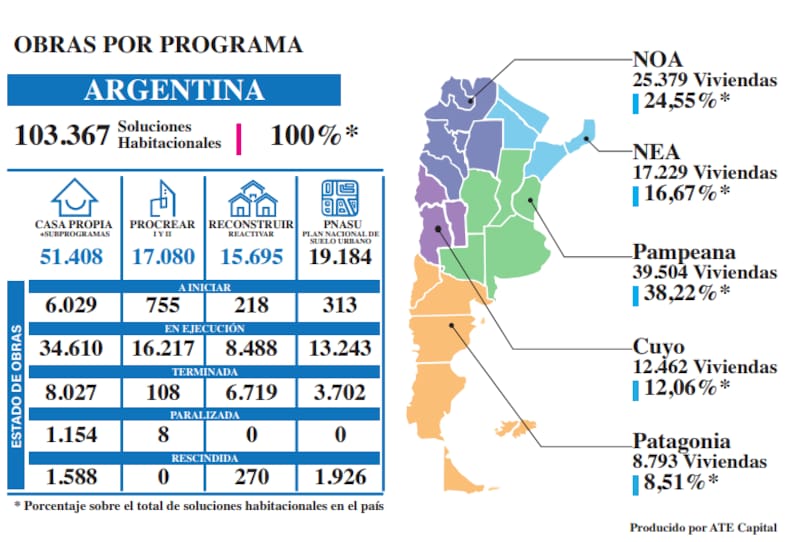 En la actualidad, existen 103 mil obras en ejecución y 15 mil viviendas terminadas que no fueron entregadas por el gobierno nacional. Esto último se debió a que el Ejecutivo no abrió ninguna adjudicación este año para entregar dichas unidades habitacionales.
