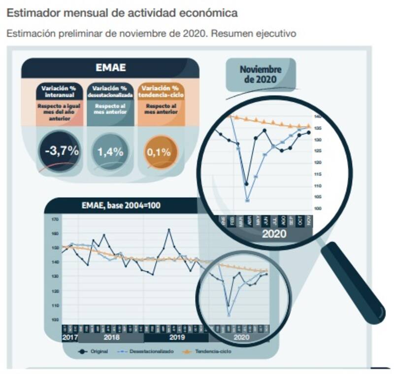El Estimador Mensual de la Actividad Económica (EMAE) registró en noviembre un caída de 3,7% en relación al mismo mes de 2019 y contabilizó un retroceso de 10,6% en los primeros once meses del año pasado.