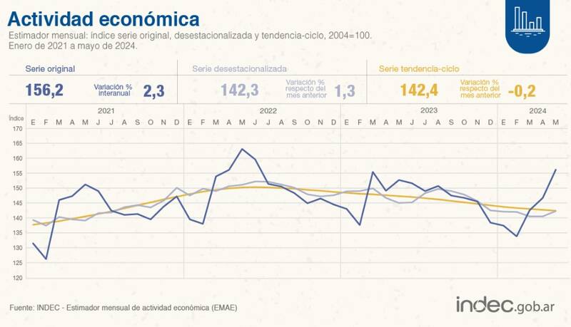 El Instituto Nacional de Estadística y Censos (INDEC) informó este jueves que la actividad económica creció en mayo un 2,3% en la comparación interanual (ia) y un 1,3% respecto a abril en la medición desestacionalizada