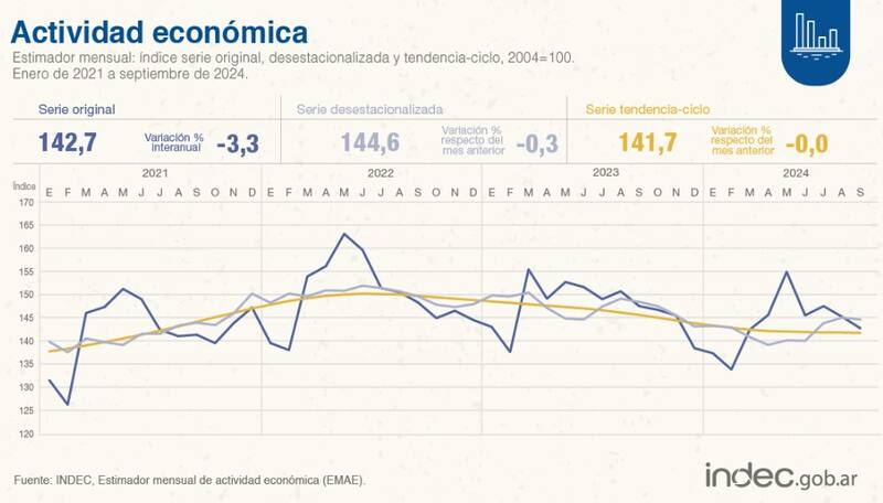 La inflación baja y el dólar luce controlado, pero la actividad económica sigue sin levantar cabeza. El EMAE, el estimador mensual que elabora el INDEC, y que dio a conocer este viernes, arrojó que en septiembre de 2024 disminuyó 3,3% respecto al mismo mes de 2023.