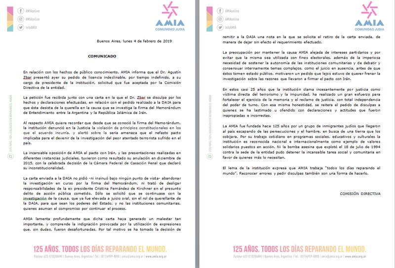 Luego de que el presidente de la AMIA, Agustín Zbar, pidiera ayer de licencia por "tiempo indefinido", tras haberle solicitado a la DAIA que desistiera de la querella contra la ex presidenta Cristina Fernández de Kirchner por la firma del Memorándum de entendimiento con Irán, hoy la mutual difundió un comunicado en el que se informa que la solicitud “fue aceptada por la Comisión Directiva de la entidad . Además, solicitó el "retiro de la carta enviada".