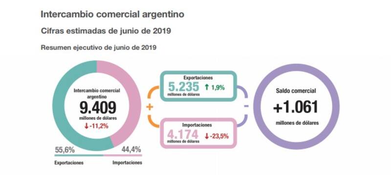 Mientras que, por el lado de las importaciones, registraron una fuerte caída de 23,5% interanual (cayeron 27,9% en el acumulado) y alcanzaron los u$s 4174 millones en dicho período. De esta manera, el intercambio comercial argentino durante junio fue de u$s 9409 millones, lo que representa una variación del -11,2% respecto al mismo mes del año anterior.