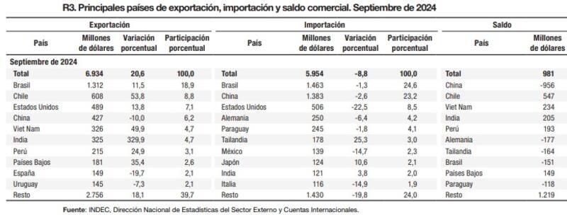 El Instituto Nacional de Estadística y Censos (INDEC) informó un superávit comercial de U$S 981 millones en septiembre, registrando un resultado positivo por décimo mes consecutivo.