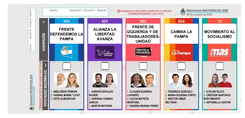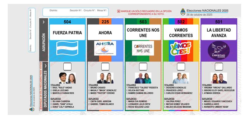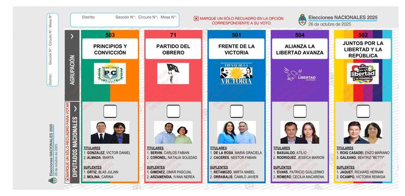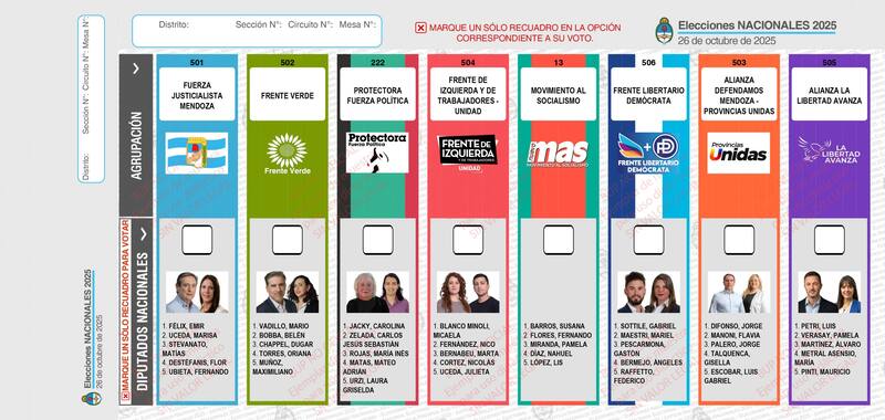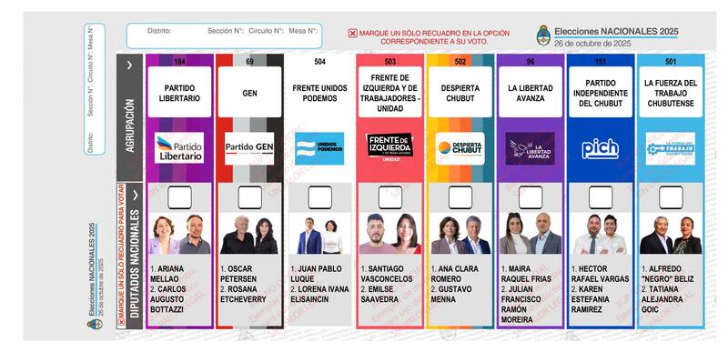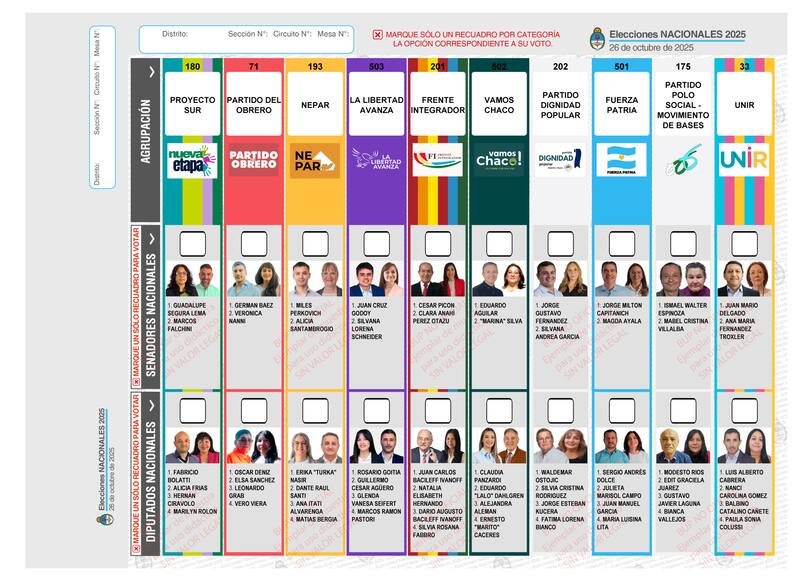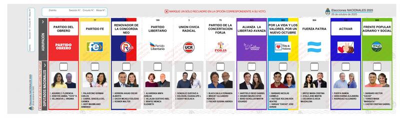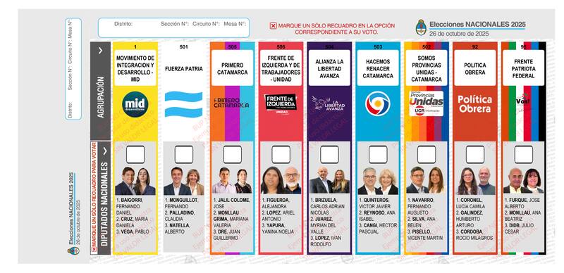 El diseño consiste en filas horizontales que representan las distintas categorías de cargos a elegir, que para este año son Senadores y Diputados Nacionales. Las columnas verticales refieren a las agrupaciones políticas y sus candidatos.