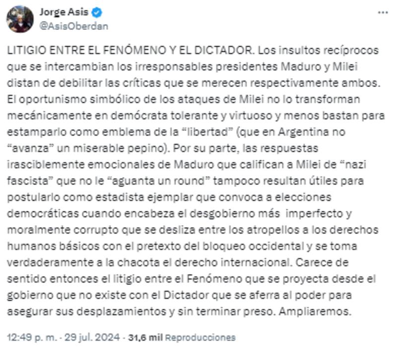 En la contraparte de Maduro, escribió que "las respuestas irasciblemente emocionales de Maduro que califican a Milei de "nazi fascista" que no le "aguanta un round" tampoco resultan útiles para postularlo como estadista ejemplar que convoca a elecciones democráticas cuando encabeza el desgobierno más imperfecto y moralmente corrupto".