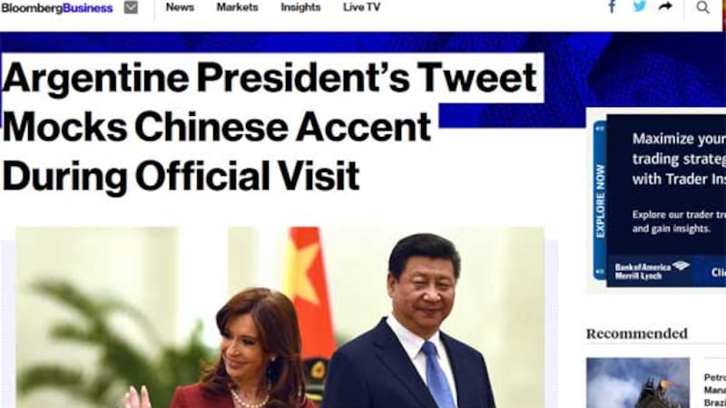 “La cuenta de Twitter de la presidenta argentina se burla con un acento chino durante una visita oficial”, tituló un artículo de la agencia de noticias Bloomberg. “La presidenta argentina, Cristina Fernández de Kirchner, imita el acento chino en un tweet, y sustituye la “r” por la “l”, cuando se encontró con el presidente de China, Xi Jinping, durante una visita a ese país para aumentar las inversiones en la golpeada economía argentina”, explica el cable de noticias.