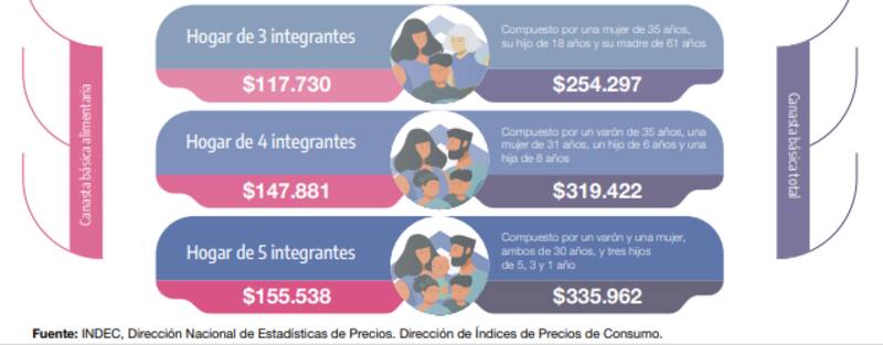 En ambos apartados el INDEC informa montos estimados para familias de tres, cuatro y cinco integrantes que se conforman con diversos integrantes que toman en cuenta padres, hijos y adultos mayores a cargo.