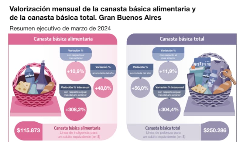 Asimismo, un hogar compuesto por tres integrantes registró una CBA de $ 285.048 y una CBT de $ 615.705; una vivienda con cuatro personas tuvo una CBA de $ 358.049 y una CBT de $ 773.385; y una casa con cinco miembros mostró una CBA de $ 376.588 y una CBT de $ 813.431.