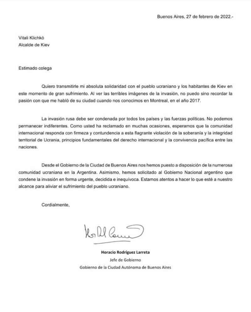 En el mismo sentido, el jefe de Gobierno porteño había hecho pública el lunes una carta que le envió a Vitali Klichkó, el ex boxeador profesional que es alcalde de Kiev y del que Rodríguez Larreta resaltó "la pasión" con la que lo escuchó hablar de su ciudad cuando lo conoció en 2017.