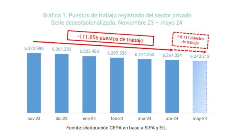 Donde hay coincidencias es en el impacto en mayor o menor grado de la política económica del Gobierno nacional sobre los diversos sectores. Acorde a un informe del CEPA, entre noviembre de 2023 y abril de 2024 se perdieron ya unos 111 mil puestos de trabajo. La encuesta que Trabajo realiza entre los empresarios proyecta un mayo igual de negativo en el que se podrían contabilizar 18 mil bajas más.