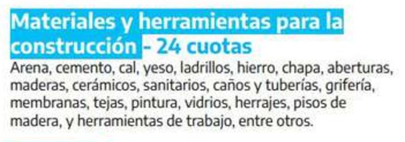 Las materias primas que utiliza el sector no estarán incluídas en el Ahora 30, sino en el plan Ahora 24. Exactamente se podrá conseguir con financiación: arena, cemento, cal, yeso, ladrillos, hierro, chapa, aberturas, maderas, cerámicos, sanitarios, caños y tuberías, grifería, membranas, tejas, pintura, vidrios, herrajes y pisos de madera.