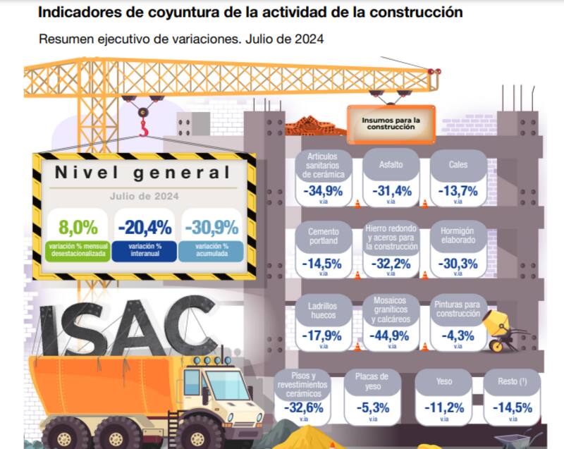 No obstante, en julio de 2024 el indicador sintético de la actividad de la construcción (ISAC) muestra una baja de 20,4% respecto a igual mes de 2023. El acumulado de los siete meses de 2024 del índice serie original presenta una caída de 30,9% respecto a igual período de 2023.