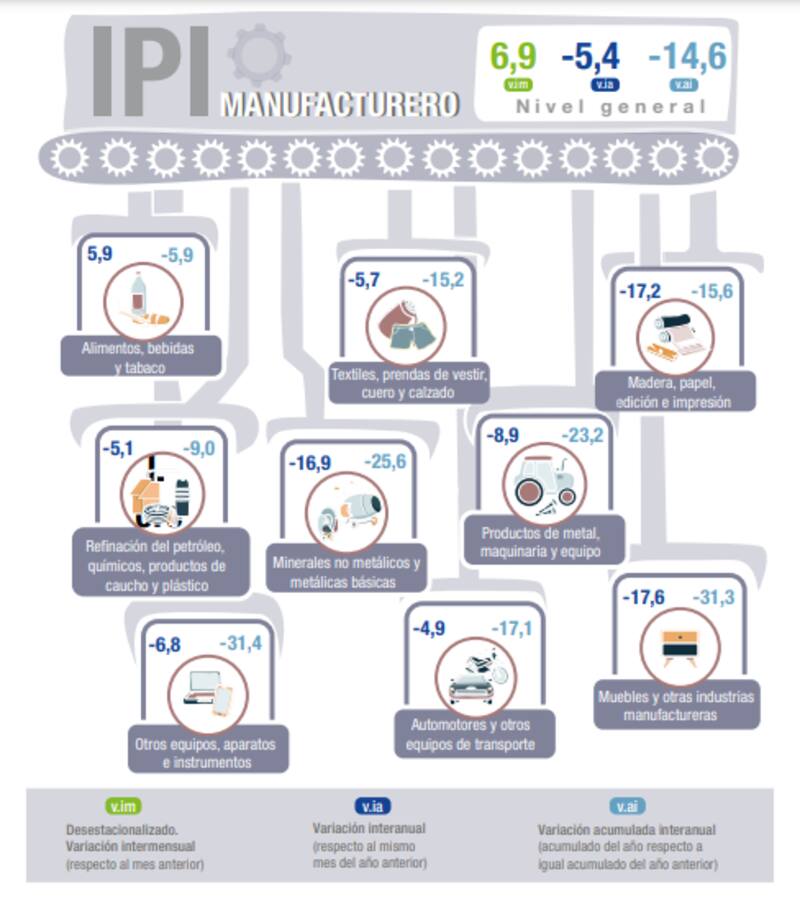 En orden a su incidencia en el nivel general, se registraron disminuciones en "Madera, papel, edición e impresión", 17,2%; "Productos minerales no metálicos", 25,4%;"Productos de caucho y plástico", 18,9%; "Industrias metálicas básicas", 10,2%; "Muebles y colchones, y otras industrias manufactureras", 17,6%; "Maquinaria y equipo", 9,1%; "Productos textiles", 15,8%; "Sustancias y productos químicos", 2,6%; "Productos de metal", 8,6%; "Vehículos automotores, carrocerías, remolques y autopartes", 5,8%; "Otros equipos, aparatos e instrumentos", 6,8%; "Productos de tabaco", 17,5%. "Prendas de vestir, cuero y calzado" presenta una variación negativa cercana a cero.