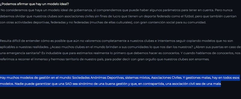 "Hay muchos modelos de gestión en el mundo: Sociedades Anónimas Deportivas, sistemas mixtos, Asociaciones Civiles. Y gestiones malas, hay en todos esos modelos. Nadie puede garantizar que una SAD sea sinónimo de una buena gestión y que, en contrapartida, una asociación civil sea de una mala", indicaron.