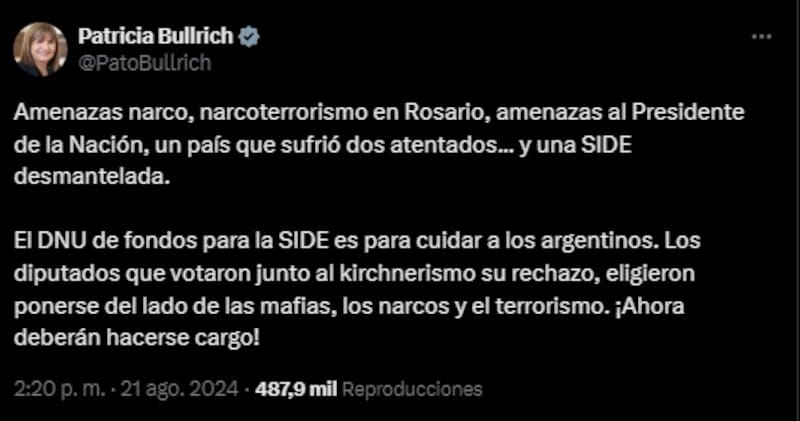 La ministra de Seguridad, Patricia Bullrich, criticó a los diputados de su propio espacio, el PRO, y otros bloques opositores que rechazaron el Decreto de Necesidad y Urgencia (DNU) destinado a otorgar 100 mil millones de pesos a la Secretaría de Inteligencia del Estado (SIDE).