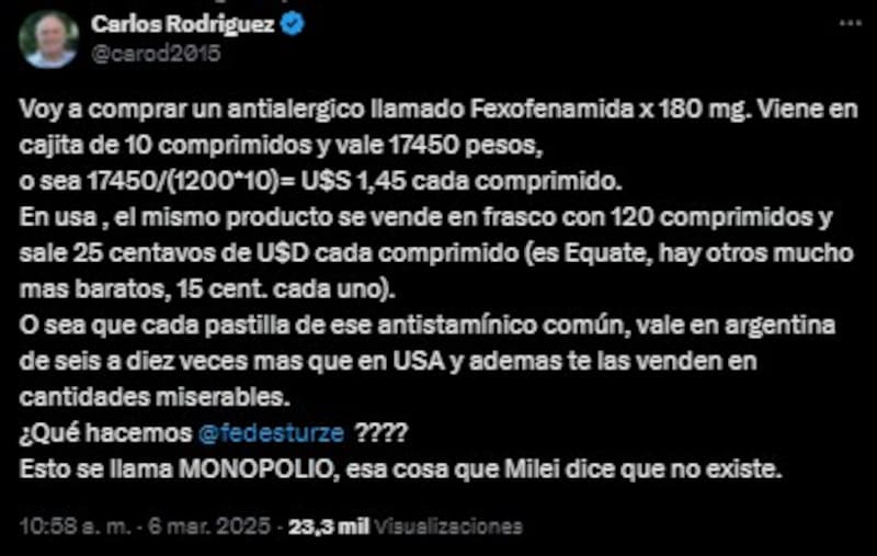 "O sea que cada pastilla de ese antihistamínico común vale en Argentina de seis a diez veces mas que en USA y además te las venden en cantidades miserables. ¿Qué hacemos Sturzenegger? Esto se llama monopolio, esa cosa que Milei dice que no existe", arremetió el ex viceministro de Economía de los '90 contra el actual funcionario.