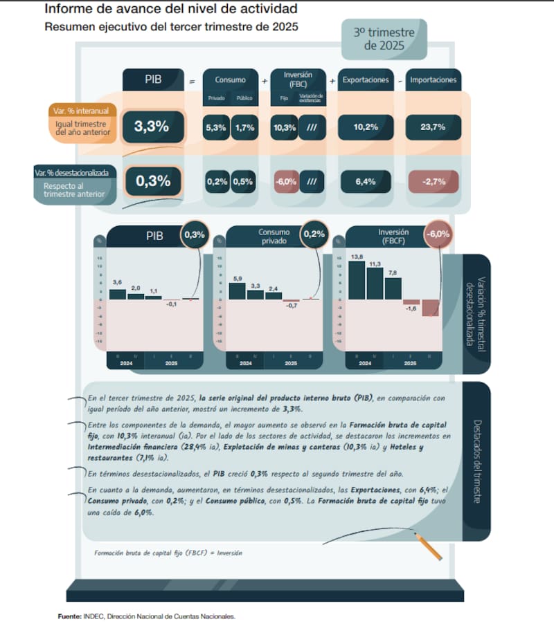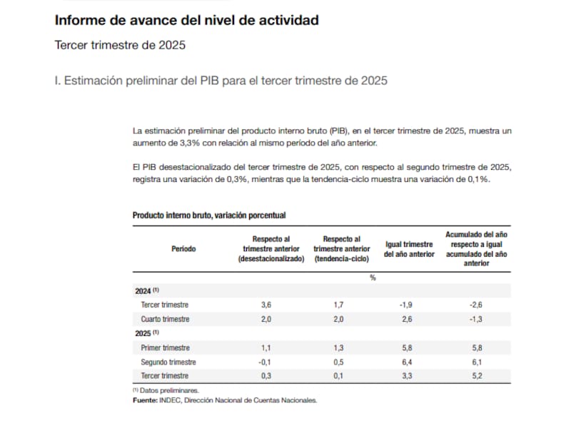 La economía argentina mostró en el tercer trimestre de 2025 una expansión interanual de 3,3%, según el Informe de avance del nivel de actividad que difundió este martes el Instituto Nacional de Estadística y Censos (INDEC). El dato confirmó la continuidad del crecimiento frente a igual período del año anterior, aunque con un desempeño moderado en la comparación trimestral.