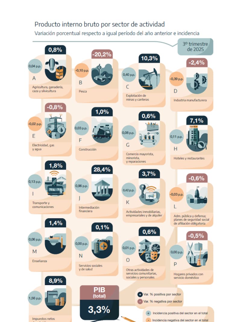 Por el lado de la oferta, la expansión del PIB estuvo liderada por algunos sectores específicos. La intermediación financiera encabezó los incrementos, con una suba interanual de 28,4%, y fue el sector de mayor incidencia positiva en el resultado agregado. También se destacaron la explotación de minas y canteras, que creció 10,3%, y hoteles y restaurantes, con un avance de 7,1%, asociado a la actividad turística y de servicios.