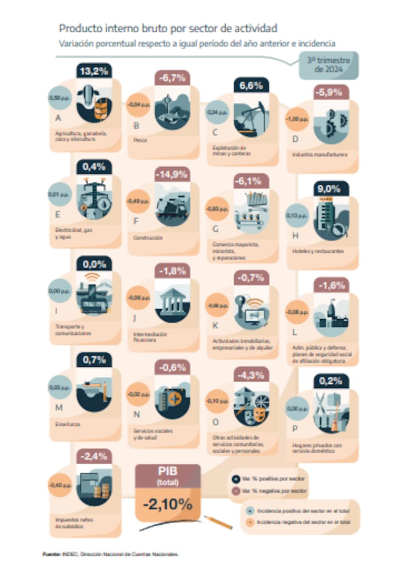 Sin embargo, al comparar la serie original del PIB con el mismo período del año anterior, se evidenció un descenso del 2,1%. Este retroceso se explicó principalmente por la caída de 16,8% interanual en la formación bruta de capital fijo. Según el informe, "los sectores más afectados fueron la construcción, con una disminución del 14,9% interanual, y la pesca, que cayó 6,7% interanual".