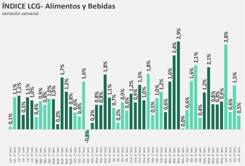 Luego de tres semanas finales de mayo con avances de 0,8/0,9%, la primera semana de junio mostró un salto de 2,8% en alimentos y bebidas, seguida de una baja importante a niveles del 0,6%, volviendo a crecer a 1,5% en la tercera semana, cerrando el mes en 0,5%.