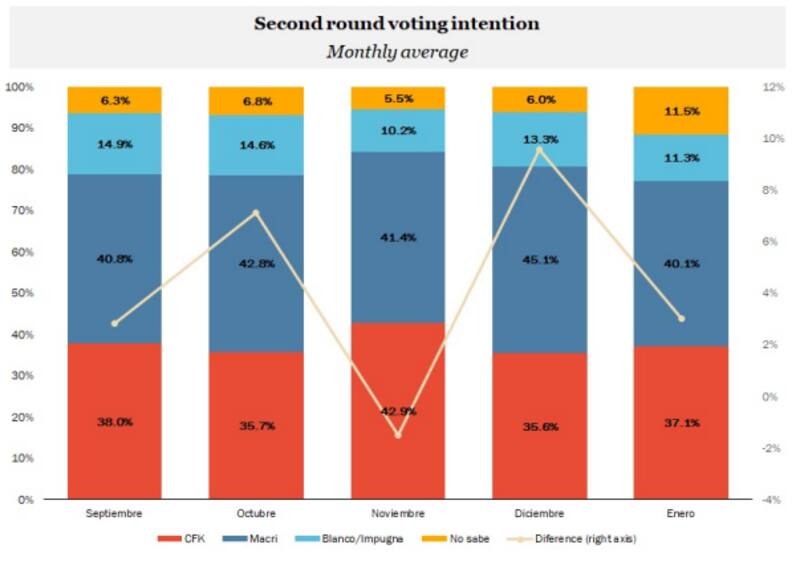 En el estudio publicado por Elypsis, se destaca que, pese a la caída en la imagen de Macri, sus encuestas muestran que, su intención de voto en una segunda vuelta contra CFK -si bien es todavía muy especulativa y cerca del 20% no respondió- ha mejorado.