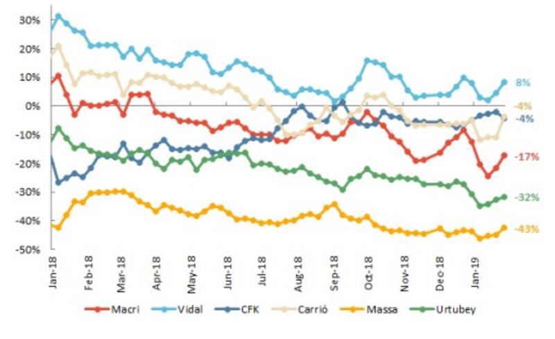 Siempre de acuerdo al mismo estudio, Macri tiene una imagen "mucho más volátil" que el resto de los dirigentes, y la ubica en -17%. Mientras que CFK (-4%), Vidal (+8%) o la diputada Elisa Carrió (-4%) se mantienen "bastante" estables.