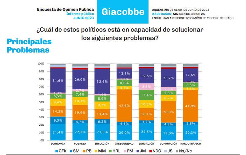 Una de las preguntas más destacadas que se realizó fue la de "¿Cuál de estos políticos está en capacidad de solucionar los siguientes problemas?" en donde se plantearon siete ejes y los consultados tenían que responder con uno de los nombres de los dirigentes políticos que considere pueda mejorar esa situación.