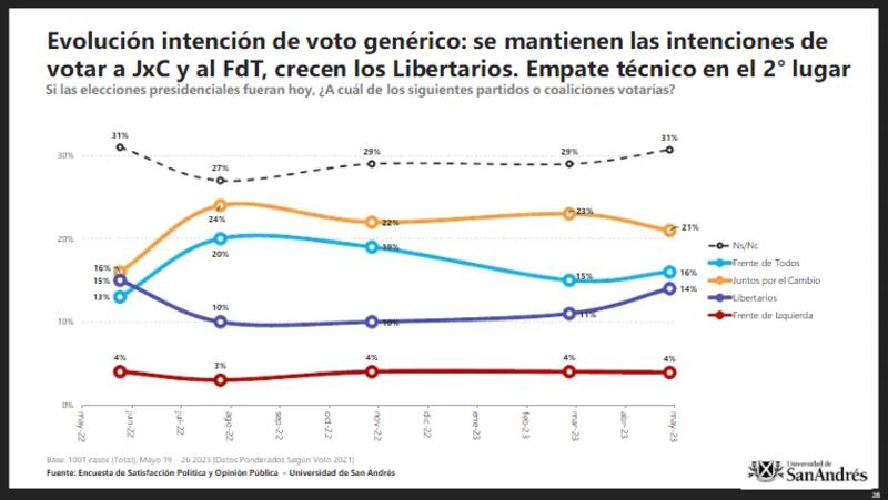 "Si las elecciones presidenciales fueran hoy, el 21% de los encuestados votaría a Juntos por el Cambio, el 16% al Frente de Todos y el 14% a los Libertarios. Por otro lado, un 25% respondió que no sabe a quién votaría y un 4% votaría en blanco mientras que un 5% no iría a votar. Hay empate técnico por el segundo lugar", describe UdeSA.