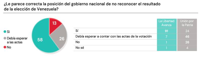 A nivel político, los puntos opuestos también se hicieron notar en la posición adoptada por el Gobierno ante el caso Venezuela. Mientras que 91% de los oficialistas avala el hecho de no reconocer el resultado divulgado por Nicolás Maduro, 46% de quienes votaron a UxP plantean que se debía esperar a contar con las actas de votación, justamente la posición que expresó este sábado la ex presidenta Cristina Kirchner.