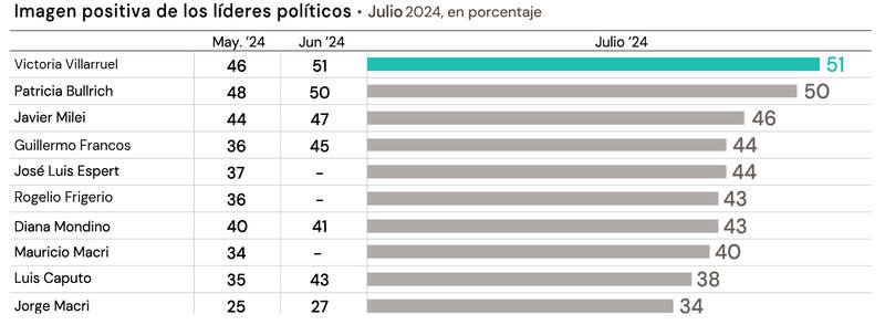 En cuestión de imagen, el relevamiento arroja que la vicepresidenta Victoria Villarruel es la dirigente con mejor imagen positiva (51%), seguida por la ministra de Seguridad, Patricia Bullrich (50%), el presidente Milei (46%) y el jefe de Gabinete, Guillermo Francos (44%).