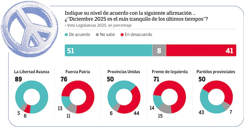 Finalmente, los temas de coyuntura aportan una señal relevante sobre el clima social. El 51% de los encuestados está de acuerdo con que “diciembre de 2025 es el más tranquilo de los últimos tiempos”, frente a un 41% que discrepa y un 8% que no tiene opinión.