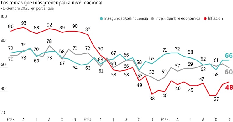 Donde el consenso social resulta más nítido es en el mapa de preocupaciones. La inseguridad se mantiene como el principal problema nacional, mencionada por el 66%, sin variaciones respecto del mes anterior y con una curva que se sostiene en niveles elevados durante todo 2025. Le sigue la incertidumbre económica, que desciende tres puntos en diciembre, del 63% al 60%, confirmando una tendencia leve a la baja hacia el cierre del año.