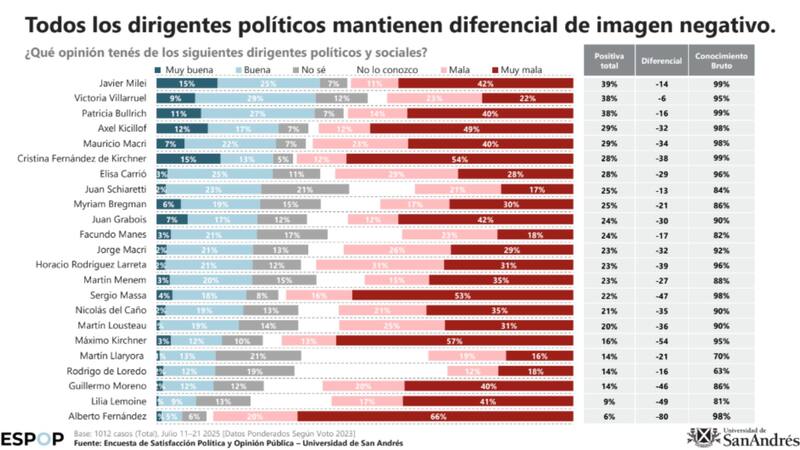 Con respecto a la imagen positiva, Javier Milei es quien mantiene el primer puesto de esta lista con 39% positiva y 53% negativa. En el caso de Axel Kicillof, el 29% está a favor y 61% en contra.