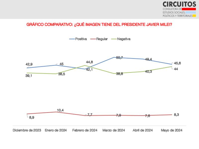 Un dato de Circuitos del que si puede sostenerse Milei es que creció con respecto a abril la cantidad de personas que dicen apoyar sus medidas y alcanzó el 45,3%, con un diferencial positivo luego de un mes en el que la tendencia se había revertido.