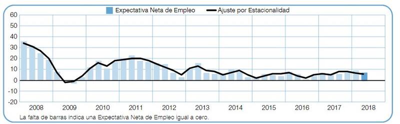 Según el informe que realiza la empresa de forma ininterrumpida hace 10 años (y que se puede consultar completo al final de esta nota), las expectativas netas de contratación entre abril y junio se ubicaron en un 6% (en la medición ajustada por estacionalidad), un punto porcentual por debajo del 7% que había registrado en los primeros tres meses de 2018, aunque un punto por encima del segundo trimestre de 2017. Con estos resultados, el balance de los primeros seis meses del año es de estancamiento con una leve tendencia positiva.